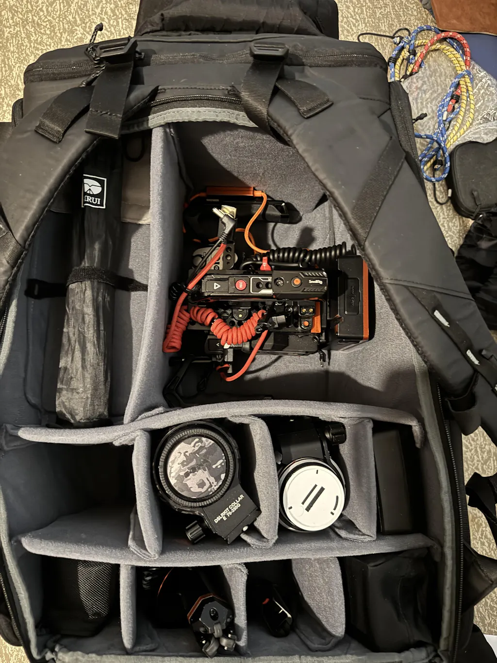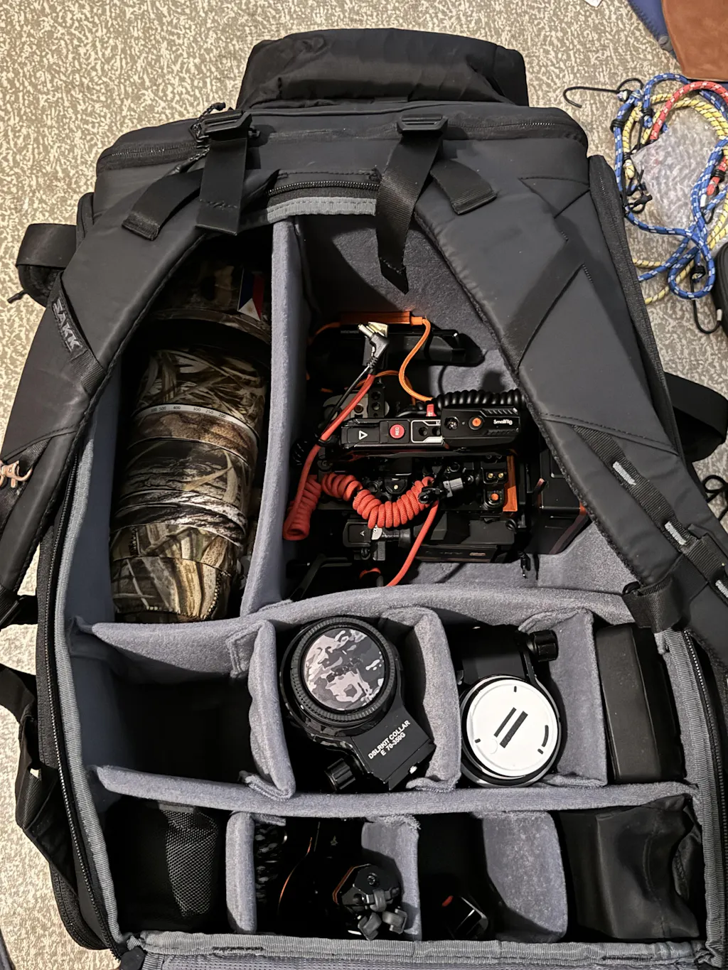 I purchased this because I found my existing PeliCase Storm IM2620 a little too deep to place in the aircraft overhead Cabins. That case was a beast, but this actually carries a lot more. I was able to fit an almost fully assembled Cinerig c/w Sony a6700 camera and V-Mount Battery. it also holds 3 additional V-Mount Batteries, a spare camera, 3 mid sized lenses a 200-600mm super -telephoto lens, flash, monitor a mamba pod / Atoll collar, gimbal and a shed load of accessories and cables. It's heavy, though appreciably lighter than the PeliCase. I even managed to attach it to a lightweight trolley, so that it can be wheeled around. This is a great bag and look forward to trying it out overseas.
