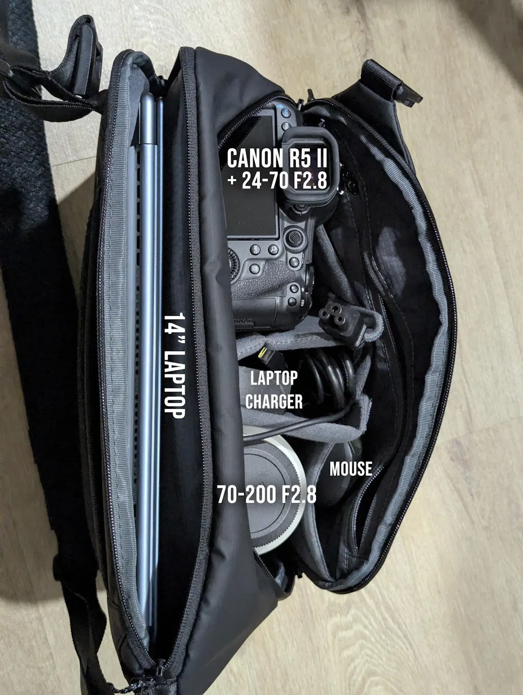 I bought this bag because I needed to be able to take my laptop and camera together. When I received it, it looked way too small, but it easily fits a 14" laptop, a Canon R5 II with 24-70, and a small water bottle - just what I wanted to load it out with. It's surprisingly comfortable, and looks very low-profile, which I enjoy. The build of the bag is pretty good too